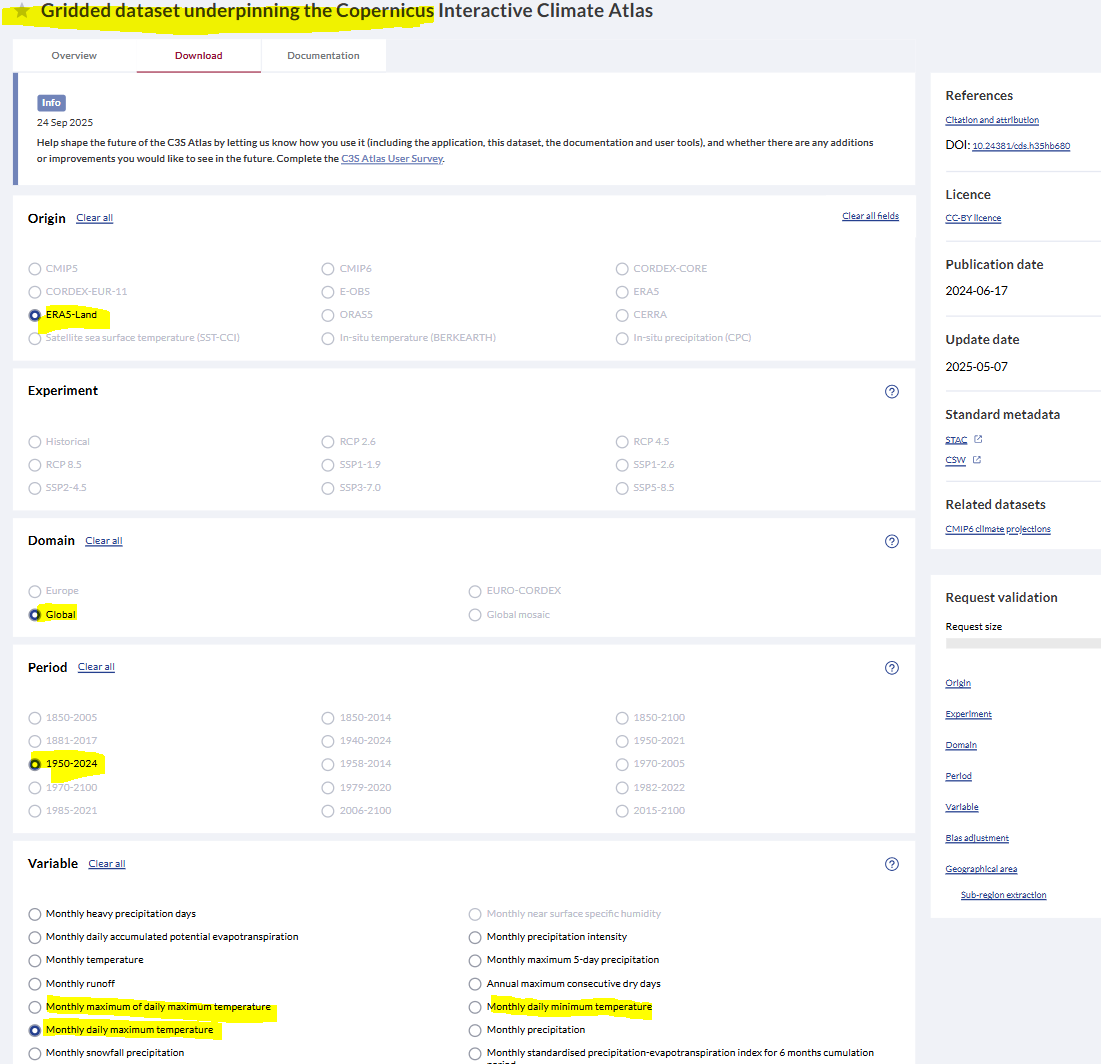 Instead, some limited maxT and minT monthly data already does exist, but is found in the “Gridded dataset underpinning the Copernicus Interactive Atlas” instead.