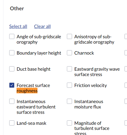 Downloaded (manually) last year data set on parameter “forecast surface roughness” (to model historic wind generation for various loation and different wind turbine types). Wanted to do the same again, but cannot find the above mentioned parameter “forecast surface roughness” anymore.