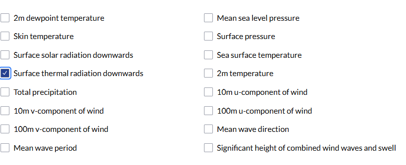 Surface solar radiation, longwave downwelling, and 100 m wind speeds have been added! These are fantastic improvements to the ERA5 service.