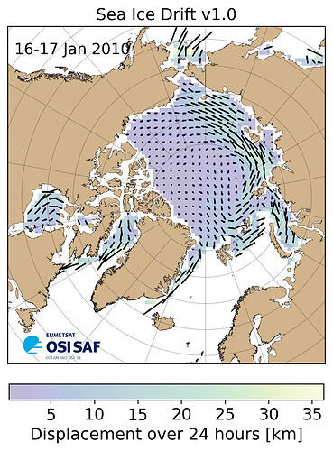 This new dataset is produced by the EUMETSAT Ocean and Sea Ice Satellite Application Facility (OSI SAF). It provides daily gridded fields of sea ice drift vectors for both hemispheres derived from atmospheric reanalysis data and brightness temperatures from the following satellite passive microwave :