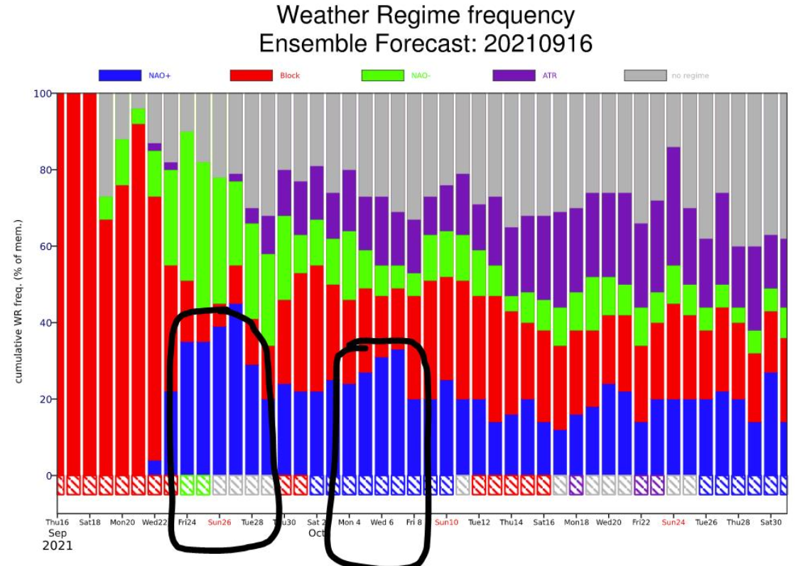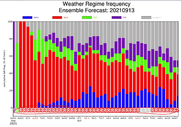 Thanks Vasilis Pappas for this interesting post. We've had some discussion on this topic this week, and this jumpiness / uncertainty is potentially due to the combination of a few factors - as you mention, the Atlantic activity and the predictability, alongside the requirement for this product to classify the forecast into these discrete categories, and possibly some influence from the time of year in terms of the transition from warm to cold regime structures. There is some interesting discussion on this in a recent newsletter article on weather regimes in extended-range predictions, and we discussed that another product that can be useful alongside these regime bar charts, to visualise these shifts and the uncertainty, is the 2D PDFs / NAO-BLO phase space diagrams.